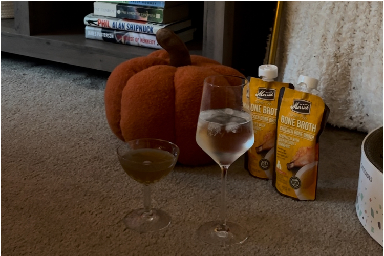 Right beside me, my cat has their own little ritual. While I pour my wine, I pour a bit of Merrick Bone Broth into a tiny wine glass, yes, their very own. And my dog? They get theirs in a cozy bowl at my feet, eagerly lapping up each warm sip. What started as a cute idea one chilly evening has become one of my favorite parts of fall.